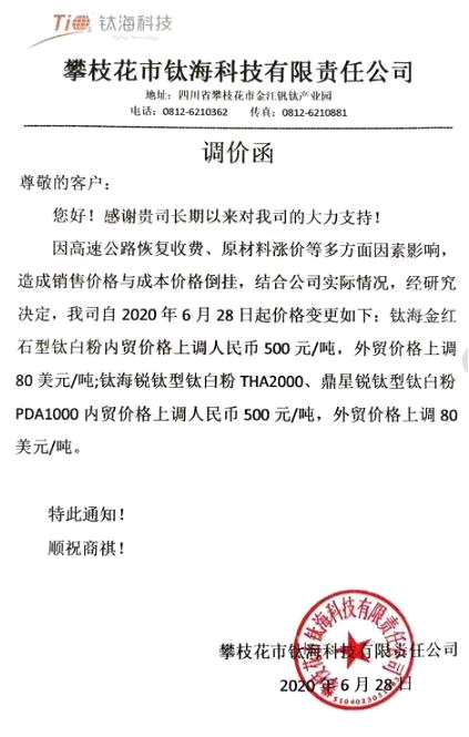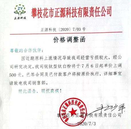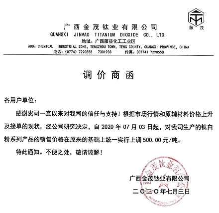 因近期原料上漲情況導(dǎo)致公司經(jīng)營虧損大,攀枝花市正源科技有限責任公司也于7月3日宣布,公司鈦瑞型鈦白粉將于7月6日起單價上調(diào)500元,已簽合同及已付款客戶將按原價折行。同樣,廣西金茂鈦業(yè)有限公司也于7月3日發(fā)布調(diào)價商函,調(diào)價函稱,公司根據(jù)市場行情和原輔材料上升及接單的現(xiàn)狀,自2020年7月3日起,公司生產(chǎn)的鈦白粉系列產(chǎn)品的銷售價格在原來的基礎(chǔ)上同一實行每噸上調(diào)500元。