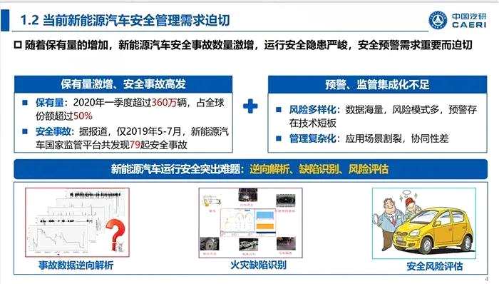 抄佩佩所負(fù)責(zé)的數(shù)據(jù)中心是中國(guó)汽研的五大中心之一,參與了多個(gè)國(guó)家政策法規(guī)以及安全課題的研究等作?;趪?guó)家新能源汽車(chē)安全的相關(guān)課題,目前積累了較為豐富的安全預(yù)警技術(shù)經(jīng)驗(yàn)。本次會(huì)議分享了新能源汽車(chē)安全預(yù)警領(lǐng)域的研究?jī)?nèi)容,希望能夠?yàn)楦鞯胤秸蜆I(yè)內(nèi)企業(yè)提供參考和幫助,主要內(nèi)容如下:
