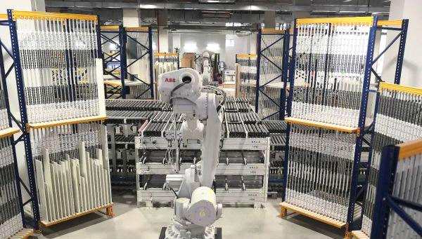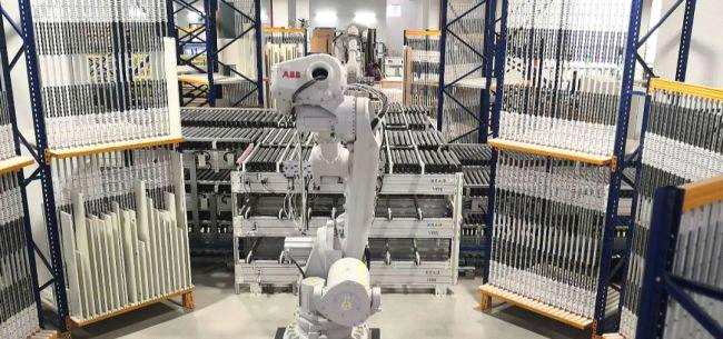 隨后,完成標(biāo)準(zhǔn)化自動(dòng)生產(chǎn)的板材進(jìn)入機(jī)器人自動(dòng)分揀區(qū)域,源自瑞士的ABB機(jī)器人通過二維碼自動(dòng)識(shí)別抓取板材,并根據(jù)板材最終去往的不同客戶進(jìn)行快速分揀,并具備自動(dòng)糾錯(cuò)功能,據(jù)介紹,分揀區(qū)的機(jī)器人是具備持續(xù)學(xué)習(xí)能力的人工智能,會(huì)在運(yùn)作中實(shí)現(xiàn)進(jìn)化提速,分揀效率會(huì)隨著時(shí)間推移不斷提升。