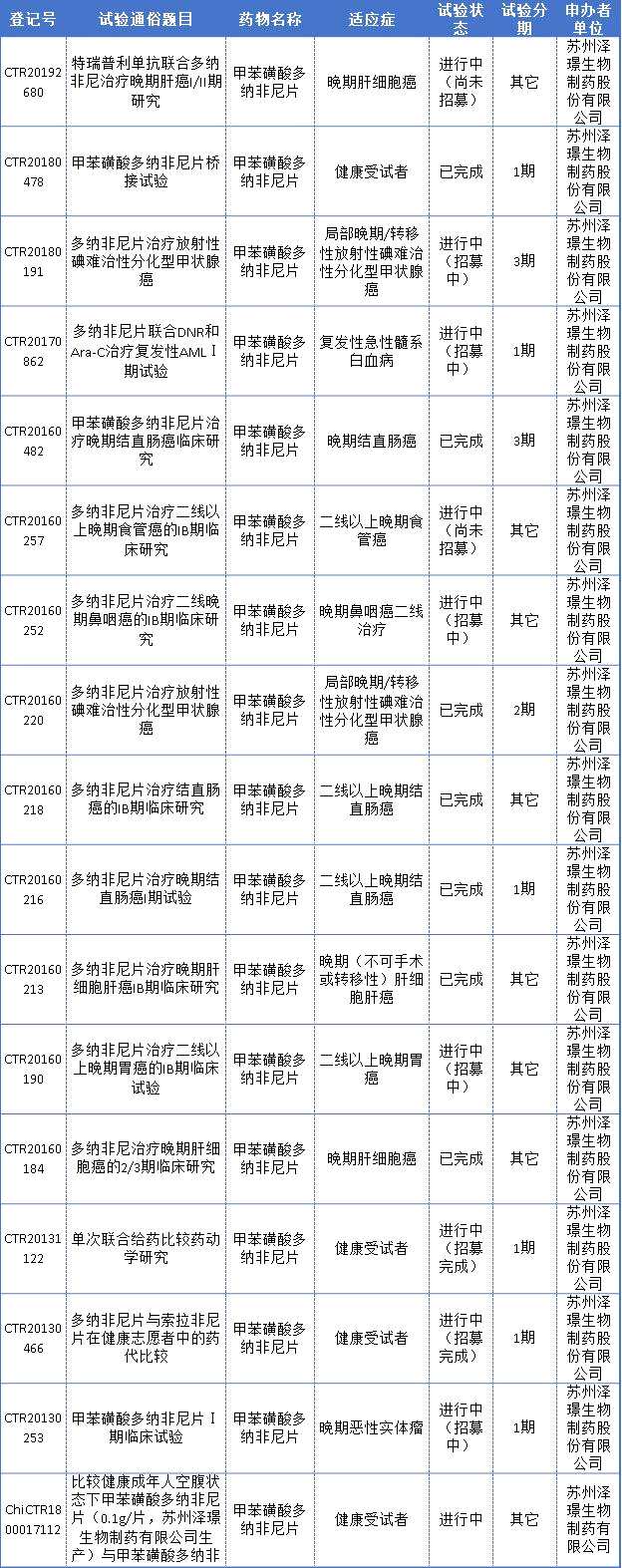 此外,多納非尼治療晚期結(jié)直腸癌和碘難治性分化型甲狀腺癌的Ⅲ期臨床研究、多納非尼與抗PD-1單抗聯(lián)合治療晚期肝細胞癌等多種惡性腫瘤的臨床研究正在進行之中。據(jù)藥智臨床實驗數(shù)據(jù)庫顯示,多納非尼臨床試驗登記號累積有17個,其中1個登記號完成了3期試驗,1個處于3期試驗中,更多詳情如下: