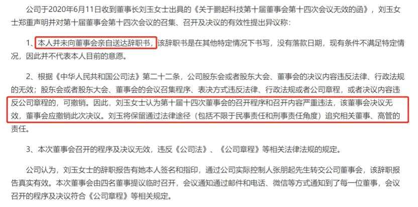 不過,此次任免部分董事棄權(quán),劉玉本人提出異議,她表示辭職書并不是本人親自向董事會送達也沒有落款日期,同時她認為這次董事會的召開程序和內(nèi)容嚴重違法。而公司方面稱,劉玉女士的辭職報告有她本人簽名和指印,通過公司實際控制人張朋起先生轉(zhuǎn)交公司董事會,該辭職報告真實有效。