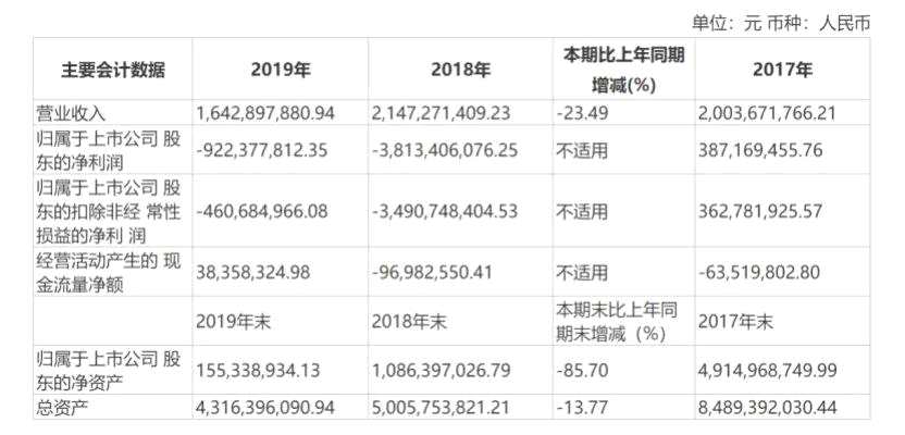 截止2018年度末,公司總資產(chǎn)為50.06億元,歸屬于上市公司股東的凈資產(chǎn)為10.86億元,歸屬于上市公司股東的凈利潤-38.13億元,歸屬于上市公司股東的扣除非經(jīng)常性損益的凈利潤-34.87億元。