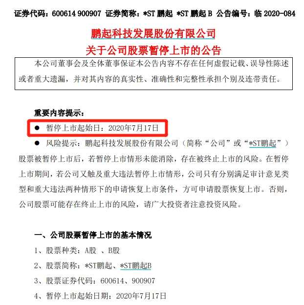 7月10日晚, 【*ST鵬起(600614)、股吧】(600614) 公告, 上海證券交易所 決定自7月17日起暫停公司股票上市。