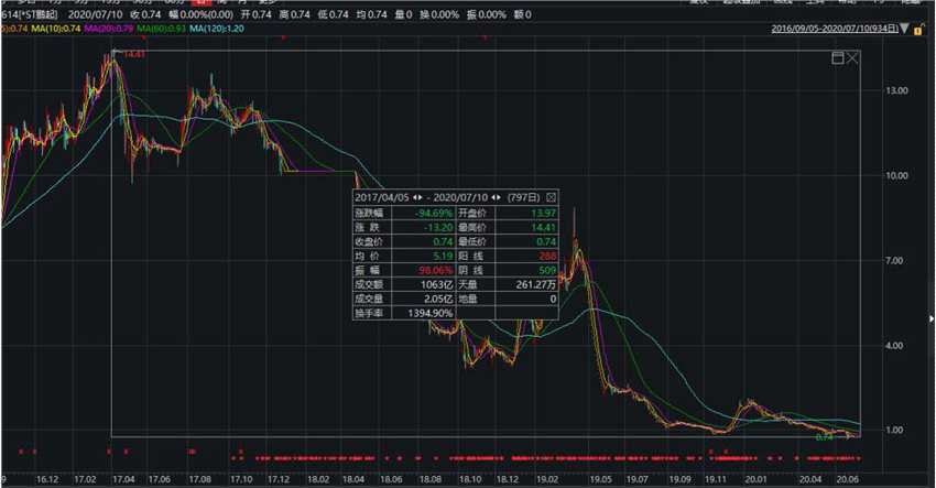 而在2017年4月初,*ST鵬起股價還一度達到14.4元的高位,市值達到250億元。但僅僅三年多,其股價便累計下跌了95%,市值蒸發(fā)240億元之巨,投資者損失慘重。
