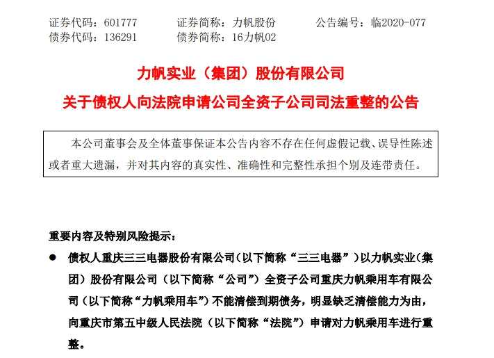 7月10日,力帆實業(yè)(集團)股份有限公司發(fā)布公告稱,因不能清償?shù)狡趥鶆?wù),10家全資子公司被債權(quán)人向法院申請司法重整,公司將存在因重整失敗而被宣告破產(chǎn)的風險。