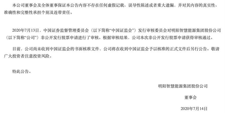 明陽智能:關于非公開發(fā)行股票申請獲得中國證監(jiān)會發(fā)行審核委員會審核通過的公告