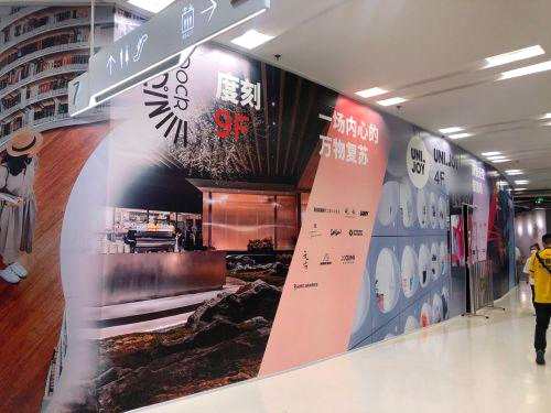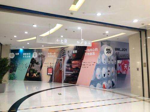 高大的噴繪版將鋪位圍起,有些顯示門店正在裝修升級,從外圍可以看見時髦的品牌廣告印著顯眼的“opening soon”,但更多則沒有任何品牌預(yù)告,擋板統(tǒng)一使用的是朝陽大悅城自己的廣告。