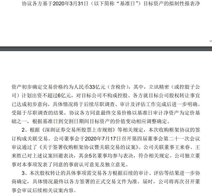 除公司及立訊有限外,可能存在其他潛在第三方共同參與此次收購。目標(biāo)資產(chǎn)初步確定交易價約33億元。立訊精密(或控股子公司)計(jì)劃出資不超6億元,對目標(biāo)公司不構(gòu)成控股。