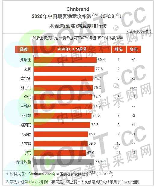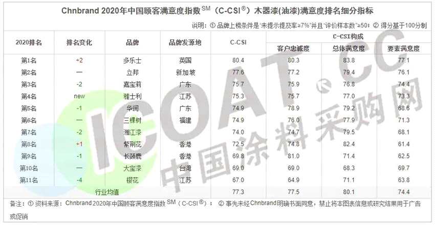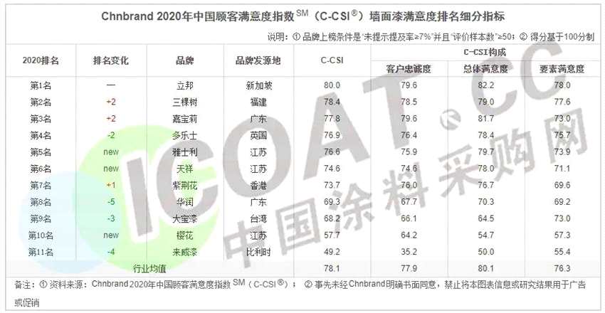 近日國內(nèi)知名品牌評級與顧問機構(gòu)Chnbrand在線發(fā)布了2020年度中國顧客滿意度指數(shù)(C-CSI)品牌排名及分析報告。立邦、三棵樹(603737)、嘉寶莉,多樂士、華潤等多個國內(nèi)外知名品牌上榜。