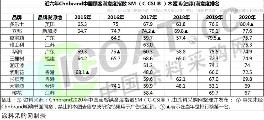 綜合近六年來木器漆(油漆)滿意度排行榜數(shù)據(jù)不難發(fā)現(xiàn),多樂士、立邦、華潤、三棵樹這四個品牌,在6年的排行榜中均有出現(xiàn),最高分為80.4分,79.1分,75.5分,74.9分,其中多樂士和三棵樹的最高分出現(xiàn)在2020年,立邦和華潤的最高分出現(xiàn)在2019年。嘉寶莉、大寶漆上榜五次,最高分值為79.5分,74.1分出現(xiàn)在2019年,長頸鹿、紫荊花上榜四次,最高分值為69.8和72.5。湘江漆、櫻花上榜3次,最高分為74.1和69.7。另外今年最新上榜的雅士利在2017年也曾上榜,同樣是排行第四,最高分為75.3分,出現(xiàn)在2020年。