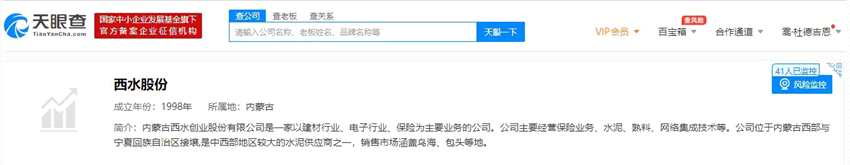 天眼查數(shù)據(jù)顯示,內(nèi)蒙古西水創(chuàng)業(yè)股份有限公司是一家以建材行業(yè)、電子行業(yè)、保險(xiǎn)為主要業(yè)務(wù)的公司。公司主要經(jīng)營(yíng)保險(xiǎn)業(yè)務(wù)、水泥、熟料、網(wǎng)絡(luò)集成技術(shù)等。公司位于內(nèi)蒙古西部與寧夏回族自治區(qū)接壤,是中西部地區(qū)較大的水泥供應(yīng)商之一,銷售市場(chǎng)涵蓋烏海、包頭等地。