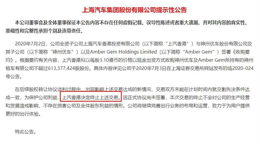 上汽集團(tuán)宣布終止收購(gòu)神州租車(chē)