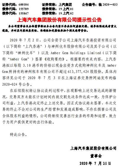 摘要: 7月20日,上汽集團(tuán)(600104)發(fā)布公告稱,公司全資子公司上汽香港決定終止收購神州租車股權(quán)的交易計(jì)劃。神州租車股價(jià)應(yīng)聲下滑,并將于今天下午1時(shí)起短暫停止買賣。