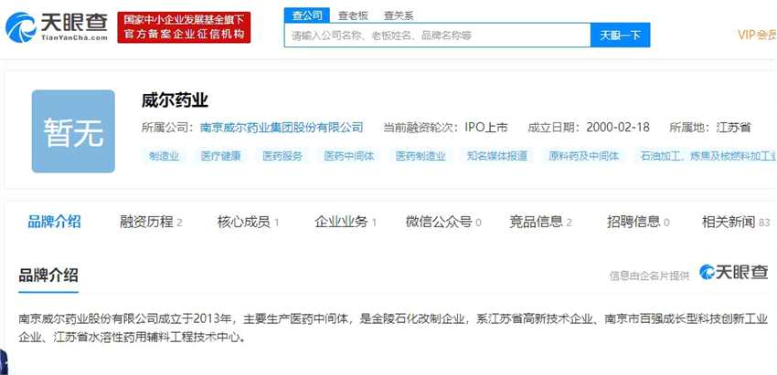 天眼查數(shù)據(jù)顯示,南京威爾藥業(yè)股份有限公司成立于2013年,主要生產(chǎn)醫(yī)藥中間體,是金陵石化改制企業(yè),系江蘇省高新技術(shù)企業(yè)、南京市百強成長型科技創(chuàng)新工業(yè)企業(yè)、江蘇省水溶性藥用輔料工程技術(shù)中心。