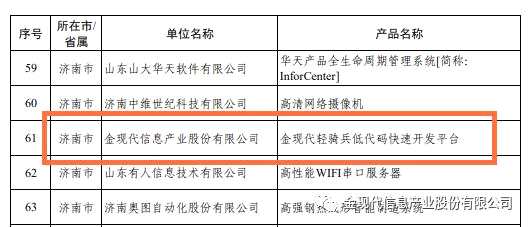 近日,山東省工業(yè)和信息化廳發(fā)布了“2020年山東創(chuàng)新工業(yè)產(chǎn)品目錄”入選名單,【金現(xiàn)代(300830)、股吧】(300830)信息產(chǎn)業(yè)股份有限公司“輕騎兵低代碼快速開發(fā)平臺”產(chǎn)品上榜。