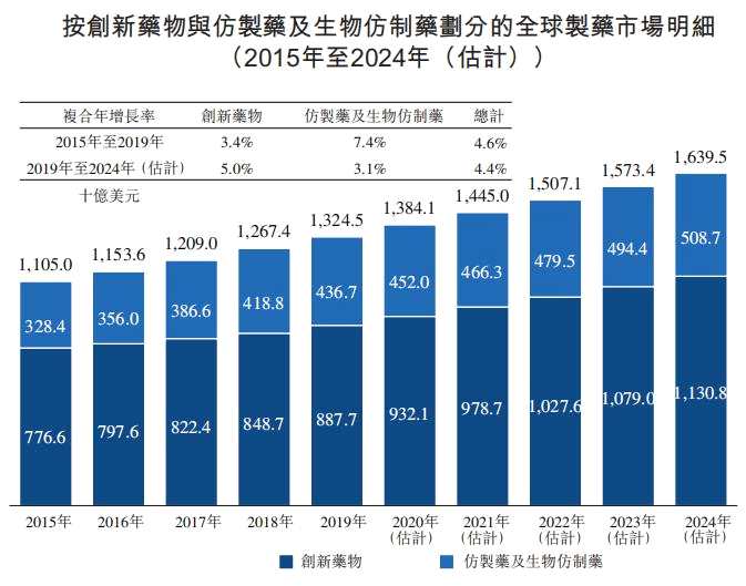 據(jù)弗若斯特沙利文報告,大眾對醫(yī)療健康產(chǎn)品的需求急增及對醫(yī)療健康行業(yè)的投資不斷增加,估計2024年全球制藥市場將達至16395億美元,中國制藥市場規(guī)模增至3226億美元。
