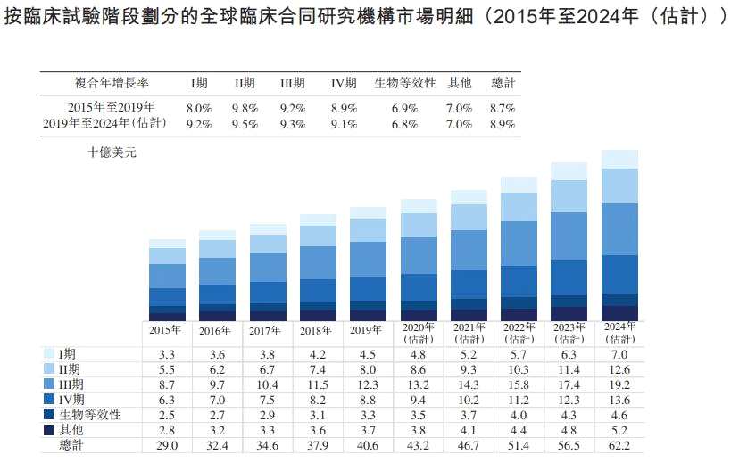 全球臨床合同研究機構(gòu)市場規(guī)模預計于2024年將增至622億美元,2019年至2024年的復合增長率為8.9%。中國臨床合同研究機構(gòu)市場預計于2024年將可達137億美元,2019年至2024年的復合年增長率為30.0%。