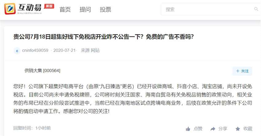 供銷大集(000564)23日在互動平臺回答投資者提問時(shí)表示,公司旗下超集好電商平臺(由原“九日臻選”更名)已經(jīng)開設(shè)微商城、抖音小店、淘寶店鋪,尚未開設(shè)免稅店。目前公司尚未申請免稅牌照,公司將時(shí)刻關(guān)注國家、海南自貿(mào)島有關(guān)免稅品銷售的政策動向,相關(guān)業(yè)務(wù)的布局已經(jīng)在分階段嘗試推進(jìn)中,當(dāng)前已經(jīng)在海南地區(qū)試點(diǎn)跨境電商業(yè)務(wù),后續(xù)在政策允許的條件下公司將酌情啟動申請工作。