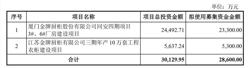 據(jù)介紹,募集資金有兩方面用途,包括廈門金牌廚柜股份有限公司同安四期項目3#、6#廠房建設(shè)項目、江蘇金牌廚柜有限公司三期年產(chǎn)10萬套工程衣柜建設(shè)項目,擬使用募集資金金額分別為2.33億元、5300萬元。金牌廚柜介紹稱,在募集資金到位前,公司可以根據(jù)募集資金投資項目的實際情況,以自籌資金先行投入,并在募集資金到位后予以置換。若扣除發(fā)行費用后的實際募集資金凈額少于擬投入募集資金總額,不足部分由公司以自籌資金解決。