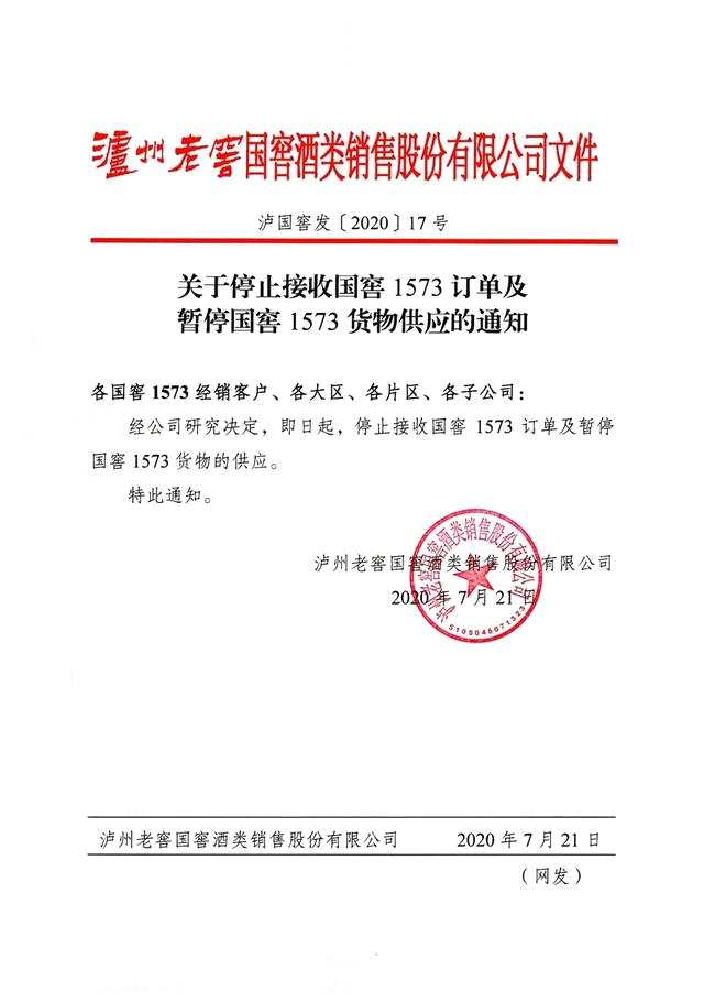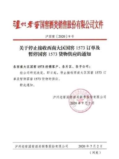 事實(shí)上,早在7月2日,瀘州老窖國窖酒類銷售股份有限公司曾下發(fā)一份停貨通知,通知主要內(nèi)容為:經(jīng)公司研究決定,即日起,停止接收西南大區(qū)國窖1573訂單及暫停國窖1573貨物的供應(yīng)。