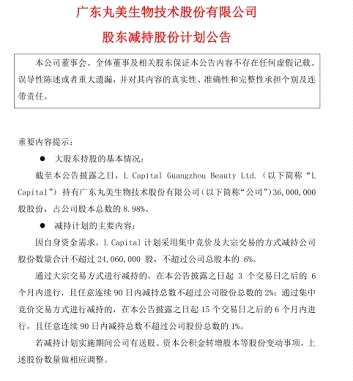 7月27日,護(hù)膚品企業(yè)廣東丸美生物技術(shù)股份有限公司(下稱“丸美股份(603983)”)披露了一則股東減持股份計(jì)劃公告。公告顯示,丸美股份股東L Capital Guangzhou Beauty Ltd.(下稱“L Capital”) 計(jì)劃減持丸美股份股份數(shù)量合計(jì)不超過2406萬(wàn)股,不超過丸美股份總股本的6%。