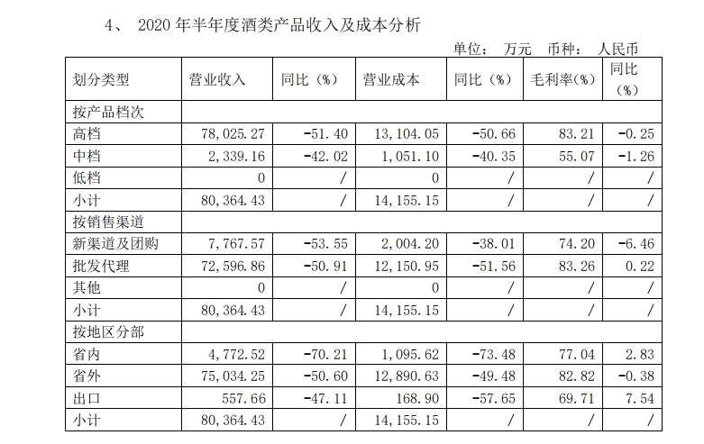 受疫情影響,白酒消費(fèi)場景幾乎停擺,酒企經(jīng)營業(yè)績也受到?jīng)_擊。在19家白酒上市企業(yè)中,水井坊率先曬出了“成績單”。根據(jù)水井坊2020年半年報顯示,公司營業(yè)收入為8.041億元,同比下滑52.41%;歸屬于上市公司股東的凈利潤為1.03億元,同比下滑69.64%。其中,新渠道及團(tuán)購銷售收入為7767.57萬元,同比下滑53.55%;批發(fā)代理銷售收入為7.26億元,同比下滑50.91%。