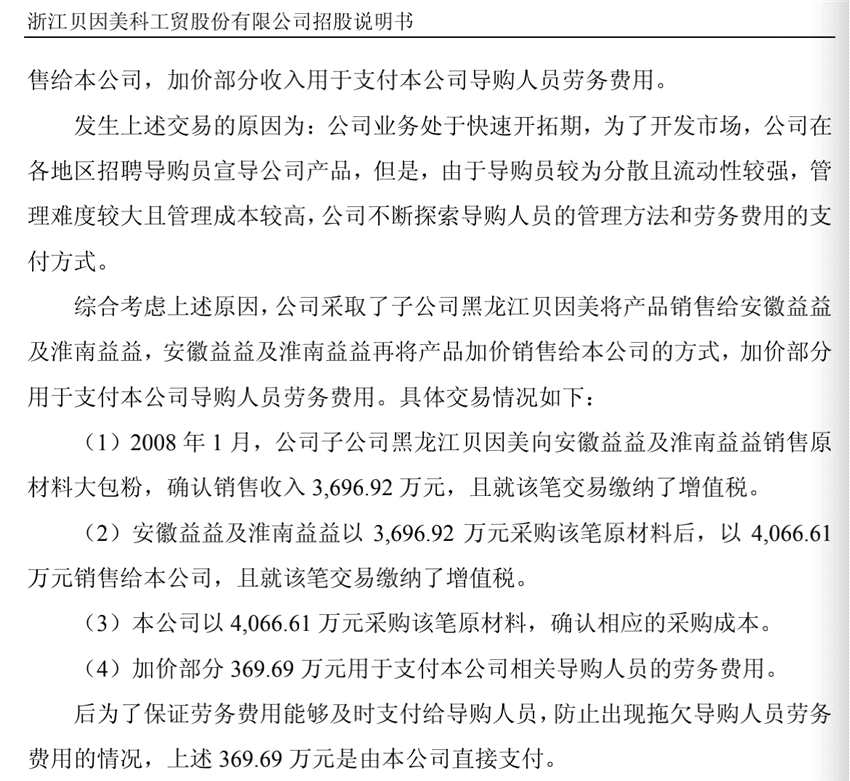 對此,貝因美的解釋為,由于貝因美導(dǎo)購員較為分散且流動性較強(qiáng),管理難度較大且管理成本較高,貝因美采取了由黑龍江貝因美將產(chǎn)品銷售給安徽益益及淮南益益,安徽益益及淮南益益再將產(chǎn)品加價銷售給本公司的方式,加價部分用于支付本公司導(dǎo)購人員勞務(wù)費用。