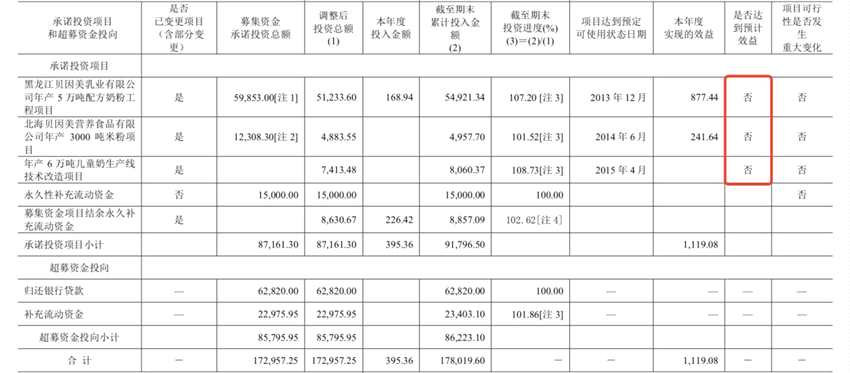 貝因美《關(guān)于募集資金年度存放與使用情況的專項報告》顯示,2019年,貝因美奶粉項目和米粉項目分別實現(xiàn)效益877.44萬元、241.64萬元,兒童奶項目則無收益。
