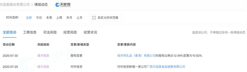 7月30日,天眼查數(shù)據(jù)顯示,貝因美發(fā)生股權(quán)變更,恒天然乳品(香港)有限公司(以下簡稱“恒天然”)的股權(quán)比例從12.49%變更為10.82%。