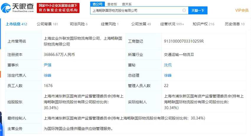 天眼查數(shù)據(jù)顯示,暢聯(lián)股份經(jīng)營范圍包括醫(yī)療器械第三方物流儲運(yùn);倉儲、分撥、配送業(yè)務(wù)及倉庫管理等,現(xiàn)總市值為38億元,最終實(shí)控人為上海市浦東新區(qū)國資委。