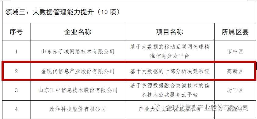 近日,濟(jì)南市工業(yè)和信息化局公示了2020年大數(shù)據(jù)產(chǎn)業(yè)發(fā)展試點(diǎn)示范項(xiàng)目名單,【金現(xiàn)代(300830)、股吧】(300830)信息產(chǎn)業(yè)股份有限公司―基于大數(shù)據(jù)的干部分析決策系統(tǒng)項(xiàng)目成功入選濟(jì)南市2020年大數(shù)據(jù)產(chǎn)業(yè)發(fā)展試點(diǎn)示范項(xiàng)目。
