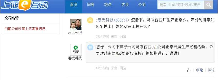 春光科技(603657)4日在互動平臺回答投資者提問時表示,公司下屬子公司馬來西亞CGH公司正常開展生產(chǎn)經(jīng)營活動,公司對越南CGH公司的投資按計劃如期進行。