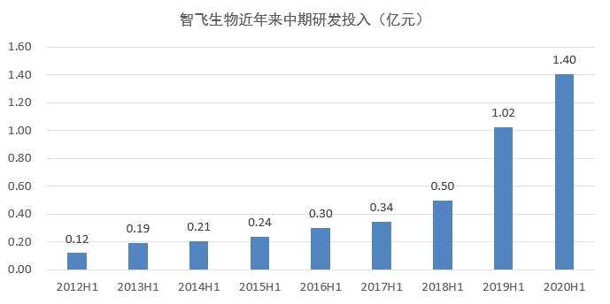技術(shù)創(chuàng)新方面,智飛生物現(xiàn)有研發(fā)基地2個(gè),研發(fā)中心1個(gè),且研發(fā)投入逐年增加。中報(bào)數(shù)據(jù)顯示,上半年智飛生物研發(fā)投入總額為1.40億元,同比增長37.03%。從更長時(shí)間來看,近年同期研發(fā)投入呈現(xiàn)逐年增長的趨勢(shì)。