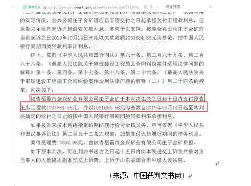 另外,中國裁判文書網(wǎng)發(fā)布的《王忠與棲霞市金興礦業(yè)有限公司莊子金礦建設(shè)工程施工合同糾紛一審民事判決書》即《山東省棲霞市人民法院民事判決書》(2019)魯0686民初3266號顯示,棲霞市金興礦業(yè)有限公司莊子金礦因拖欠工程款被告上法庭。