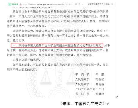 中國裁判文書網(wǎng)近期發(fā)布的《龍口金豐有限公司、棲霞市金興礦業(yè)有限公司采礦權(quán)轉(zhuǎn)讓合同糾紛一審民事裁定書》即《山東省棲霞市人民法院民事裁定書》(2020)魯0686民初561號顯示,棲霞市金興礦業(yè)有限公司被法院裁定凍結(jié)800萬元銀行存款。