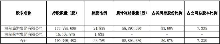 截止目前,海航旅游被司法凍結(jié)的股份數(shù)量累計為19058893630股,占其所持股份比例為30.87%,占公司總股本比例為7.33%。