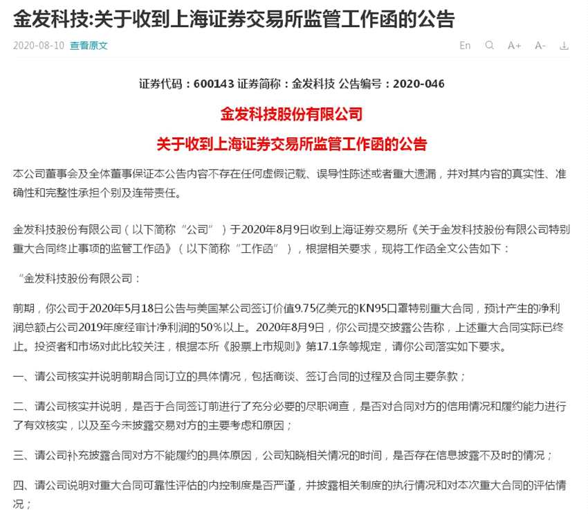 8月10日,上交所對金發(fā)科技下發(fā)監(jiān)管工作函,要求公司核實并說明前期合同訂立的具體情況,包括商談、簽訂合同的過程及合同主要條款。