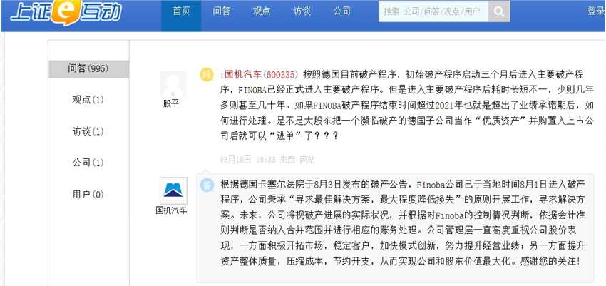 國(guó)機(jī)汽車:Finoba公司已于德國(guó)當(dāng)?shù)貢r(shí)間8月1日進(jìn)入破產(chǎn)程序