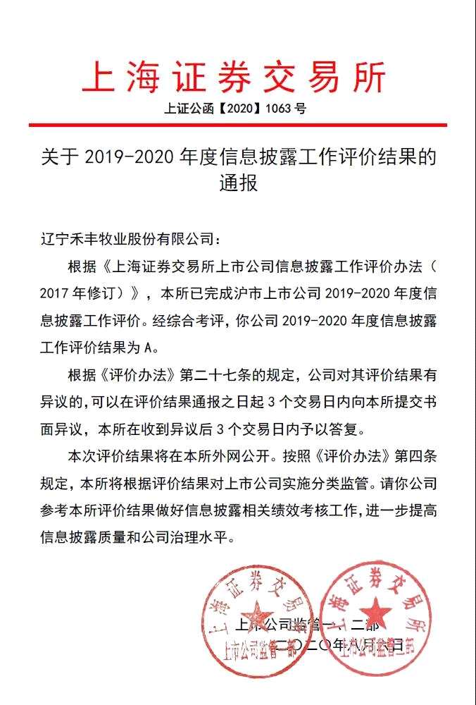 近日,上海證券交易所公布了2019-2020年度信息披露工作評(píng)價(jià)結(jié)果,禾豐牧業(yè)(603609)(603609)再次獲得A級(jí)評(píng)價(jià),這也是公司自2018年以來連續(xù)第三年獲此殊榮。
