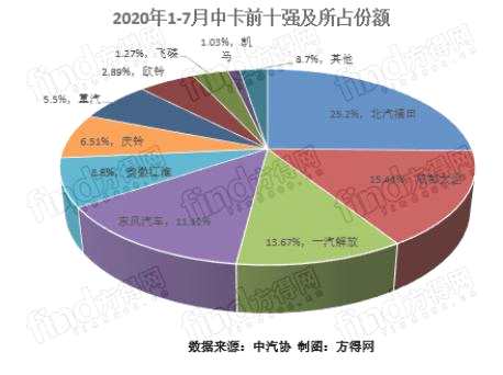2020年7月,中卡銷量前五強分別是北汽福田、成都大運、【一汽解放(000800)、股吧】(000800)、江淮汽車(600418)與東風汽車(600006)。