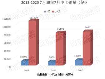 2020年7月,國內(nèi)中卡銷量為1.29萬輛,同比增長33.75%;1-7月累計銷量為8.47萬輛,比去年同期多賣3000輛,同比增長3.64%。