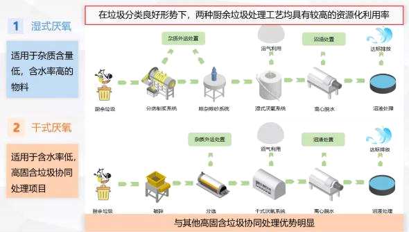 廚余、餐廚協(xié)同處理模式對(duì)于項(xiàng)目的要求是對(duì)餐廚、廚余物料兼容性好,還要分系統(tǒng)間充分考慮功能協(xié)同,有“濕式厭氧”以及“濕式+干式厭氧”兩條工藝路線。