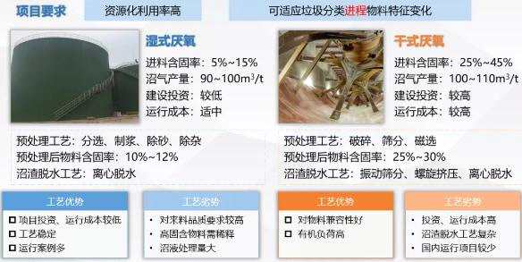 在廚余垃圾獨(dú)立處理模式中,應(yīng)用得比較廣泛的處理工藝為“濕式厭氧”和“干式厭氧”,其中濕式厭氧的優(yōu)勢(shì)為項(xiàng)目投資和運(yùn)行成本較低、工藝穩(wěn)定以及運(yùn)行案例多,同時(shí)也具有一些劣勢(shì),如對(duì)來(lái)料品質(zhì)包括預(yù)處理的系統(tǒng)和穩(wěn)定性要求都非常高,同時(shí)高固含物料需配水稀釋,以及需要增加沼液處理量和處理規(guī)模。
