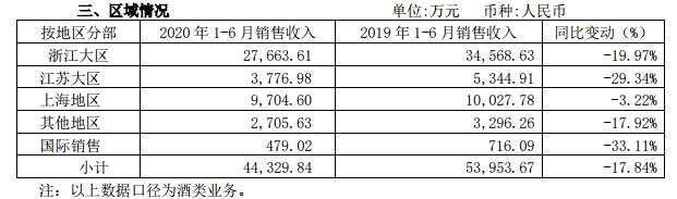 會稽山上半年凈利同比下降超28% “大本營”江蘇市場營收下降近三成