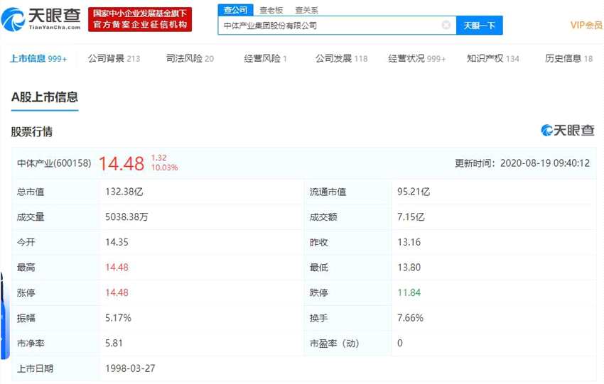 近日,受數(shù)字貨幣熱潮推動,中體產(chǎn)業(yè)(600158)收獲四連板。天眼查APP顯示,現(xiàn)市值為132億元。
