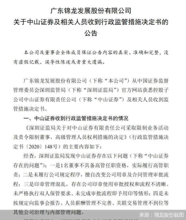 摘要: 8月20日,錦龍股份(000712)披露了關(guān)于控股子公司中山證券收到行政監(jiān)管措施決定書的公告,宣布兩個月前預告的中山證券監(jiān)管措施正式落地。事涉“四宗罪”,中山證券部分業(yè)務被監(jiān)管暫停一年。