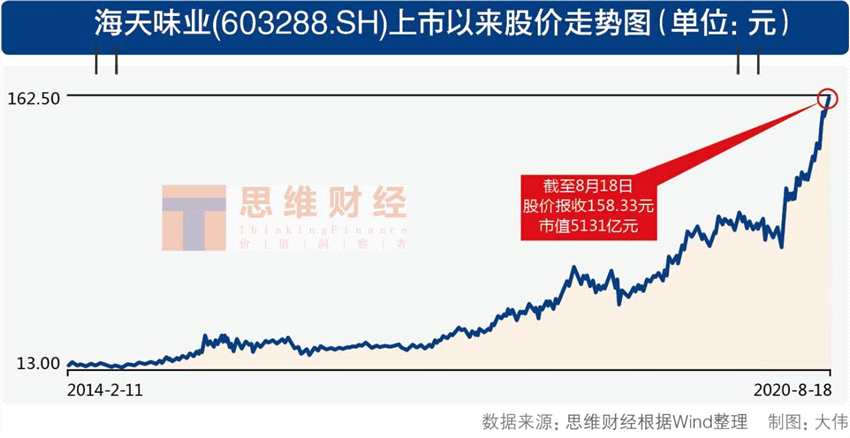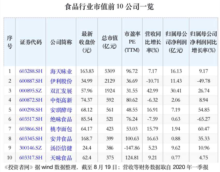 截至8月19日,海天味業(yè)的股價(jià)報(bào)收163.83元/股,市值高達(dá)5309億元,超過(guò)伊利股份(600887)和雙匯發(fā)展(000895)兩大食品飲料龍頭的市值之和。憑借這一市值,海天味業(yè)躋身中國(guó)上市公司市值排行榜的前20位。
