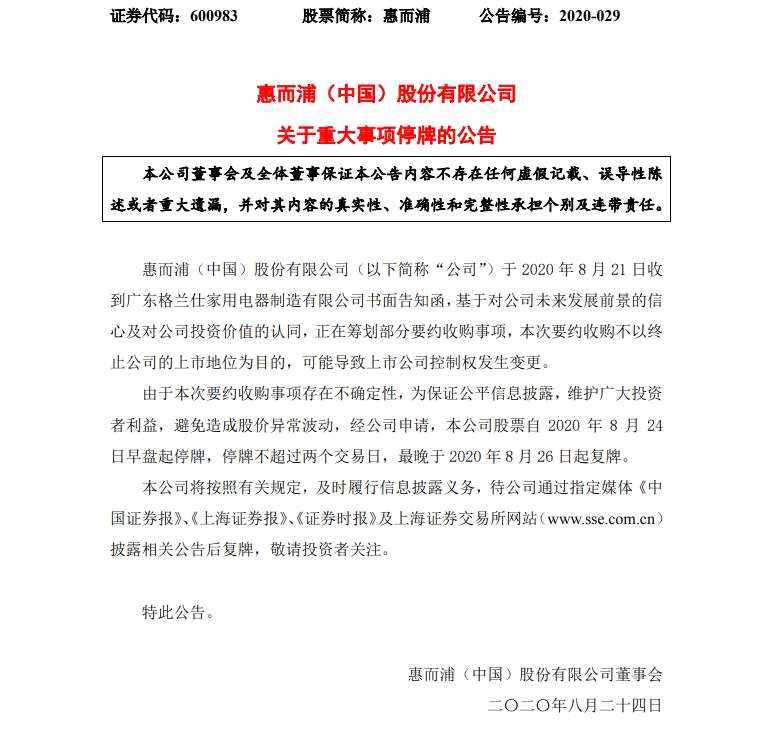 惠而浦中國(guó)在24日起停牌。惠而浦中國(guó)表示,由于本次要約收購(gòu)事項(xiàng)存在不確定性,為保證公平信息披露,維護(hù)廣大投資者利益,避免造成股價(jià)異常波動(dòng)最晚于2020年8月26日起復(fù)牌。