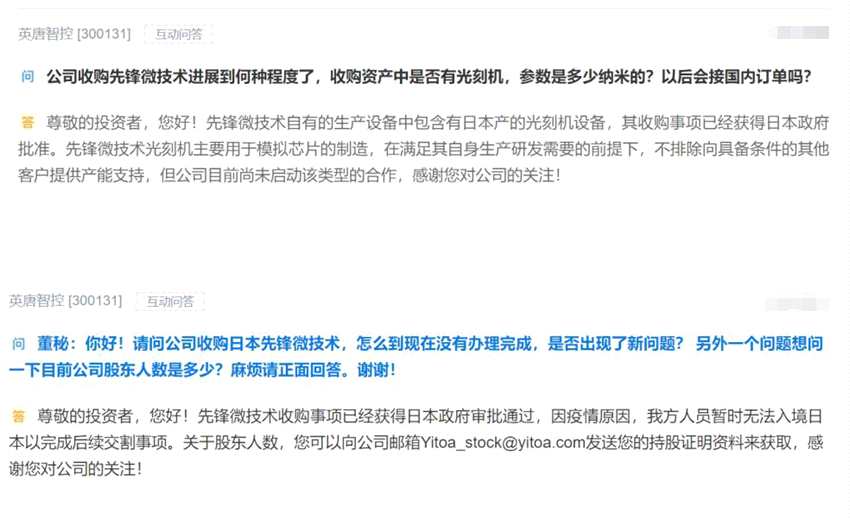 今天,英唐智控(300131)在互動平臺表示,先鋒微技術(shù)自有的生產(chǎn)設(shè)備中包含有日本產(chǎn)的光刻機(jī)設(shè)備,其收購事項(xiàng)已經(jīng)獲得日本政府批準(zhǔn)。