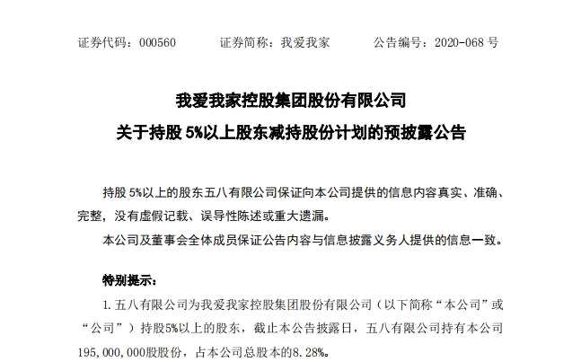 8月8日,我愛我家發(fā)布了《關于持股 5%以上股東減持股份計劃的預披露公告》.